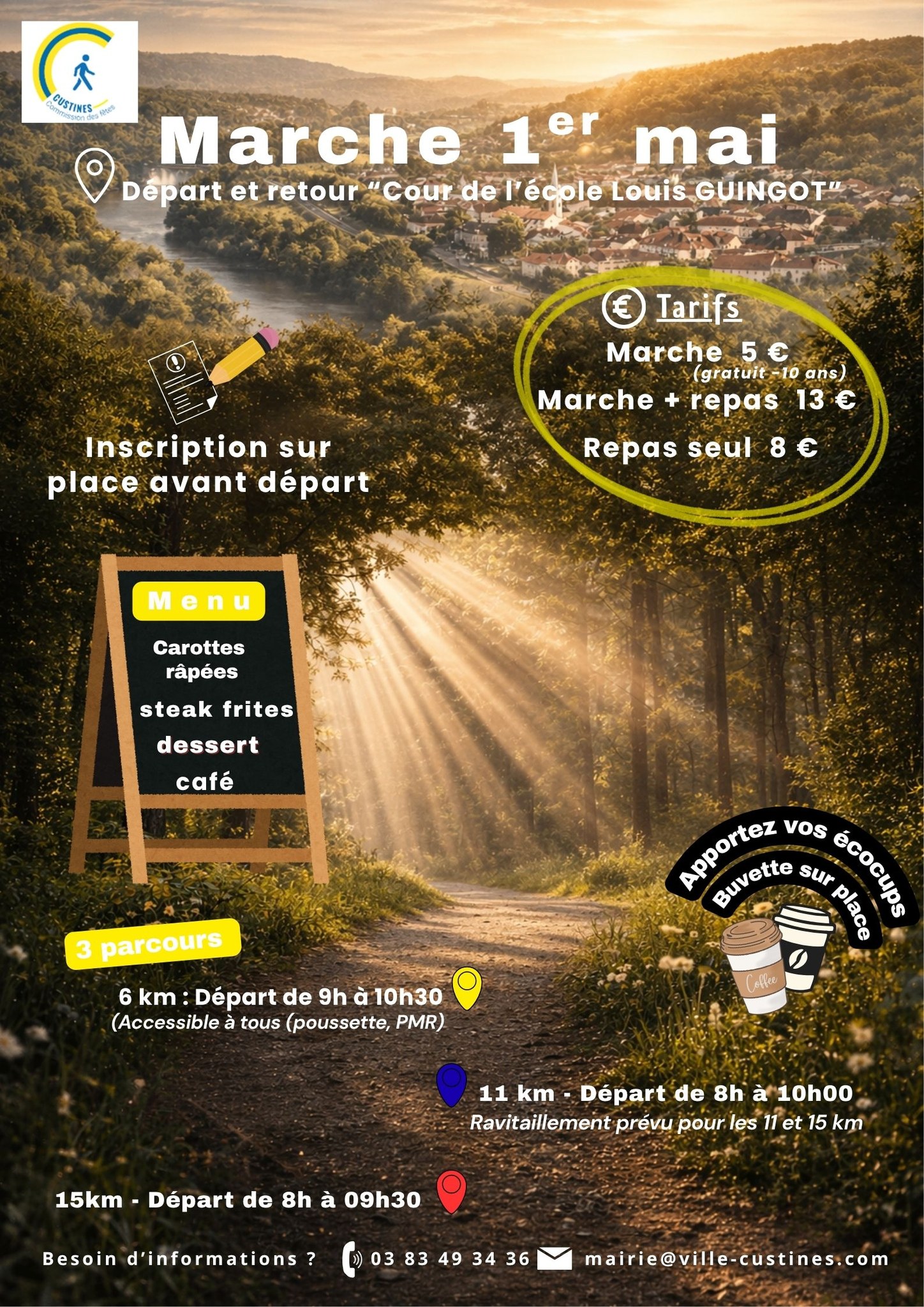 Marche + Repas = 13 € et 8€ pour les enfants de -10 ans.